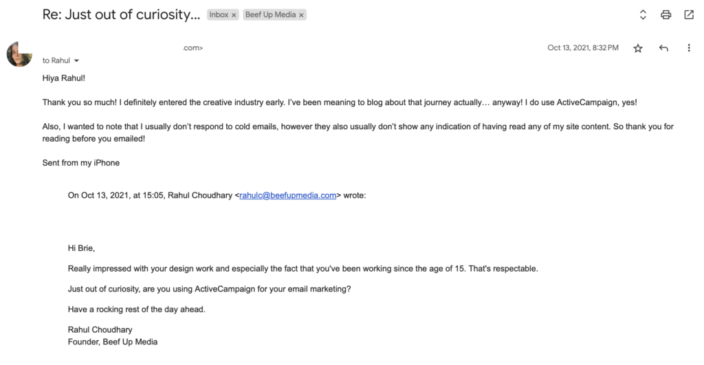 (This is from 2021 as I was heavily doing outbound at that time. I had to dig through my inbox to find this example.. as I haven’t done it since then!)